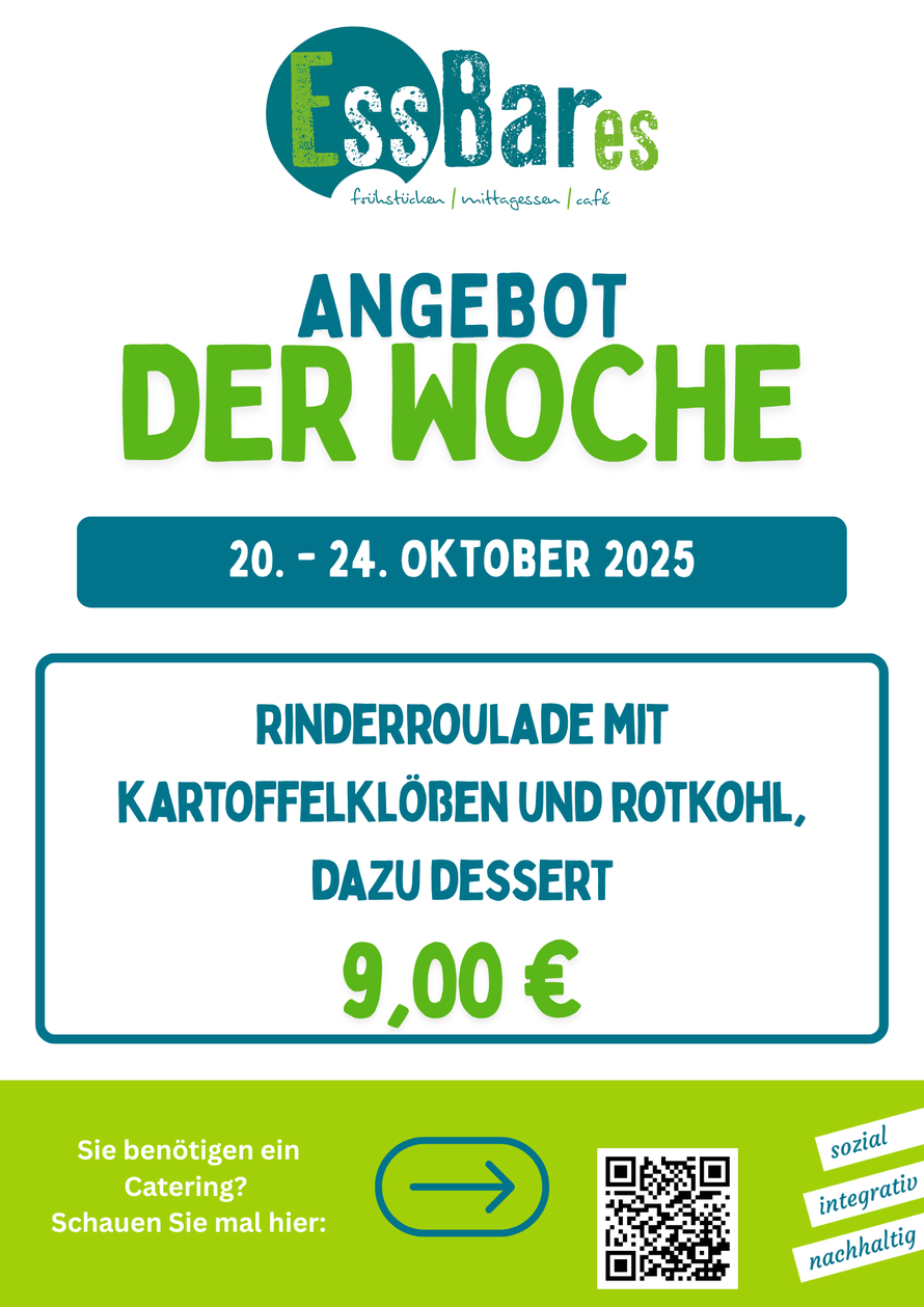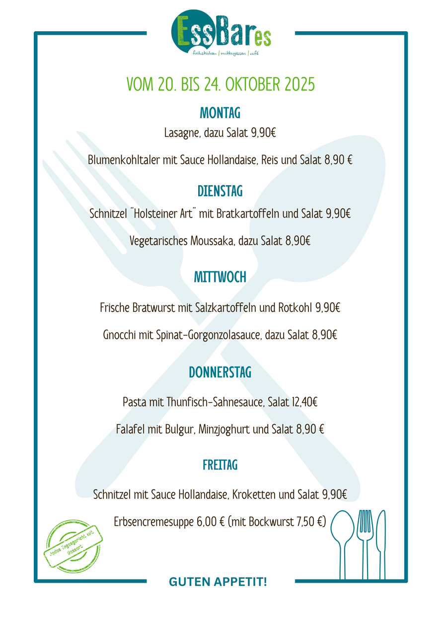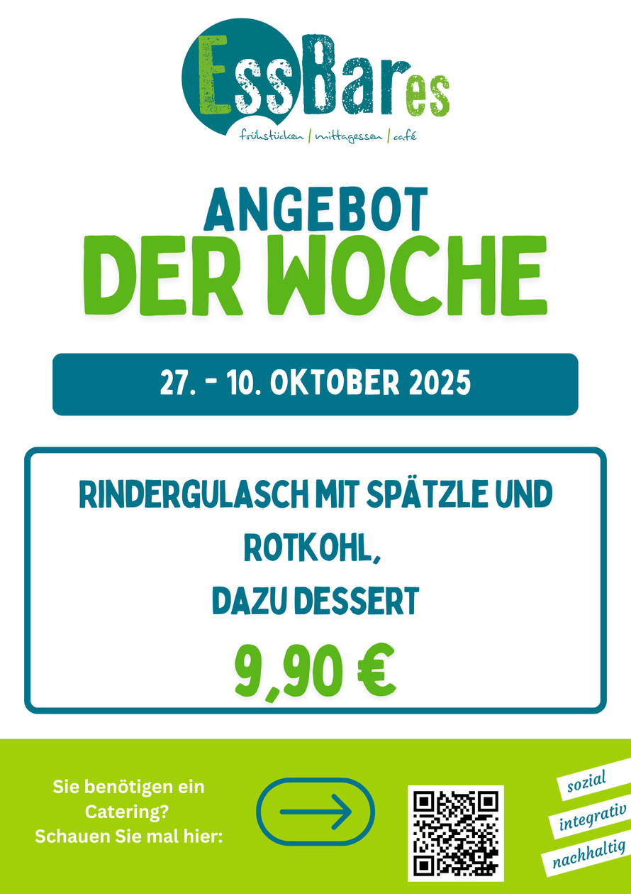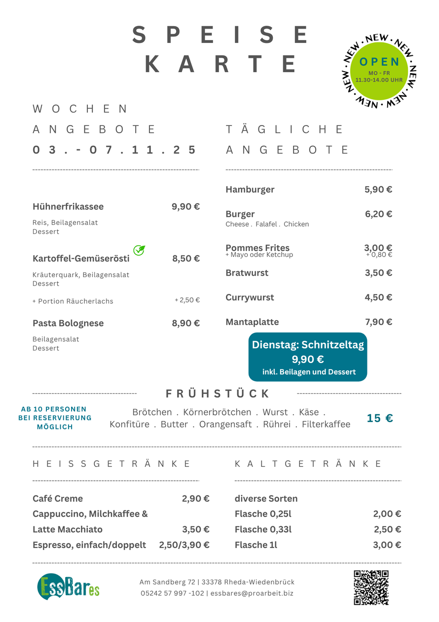Unsere EssBares ist künftig montags bis freitags von 11.30 bis 14.00 Uhr geöffnet. Für Gruppen ab 10 Personen bieten wir Ihnen nach vorheriger Anmeldung zusätzlich ein leckeres Frühstück an.