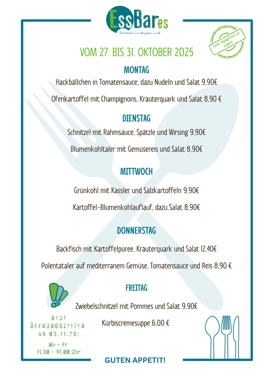 ab Montag, den 3. November 2025 passen wir unsere Öffnungszeiten und unser Speisenangebot an. Die dann gültige Speisekarte finden Sie bereits hier: